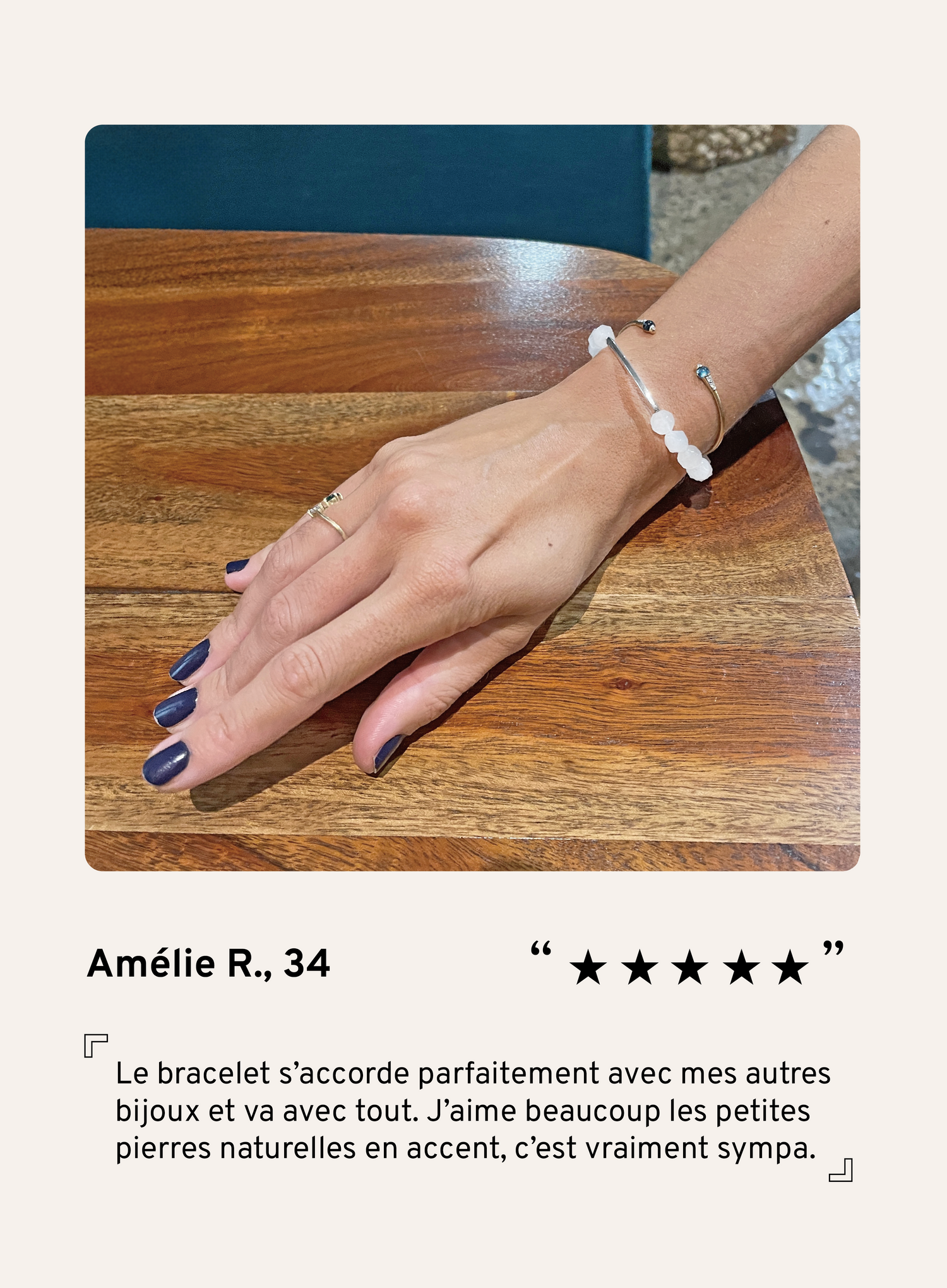 Nos créations sont fabriquées uniquement avec des pierres naturelles et de l’argent S925. Même les couleurs les plus vives ne sont jamais teintées : elles restent fidèles au design de la nature. Chaque pièce est finie à la main pour préserver son unicité et sa signification.