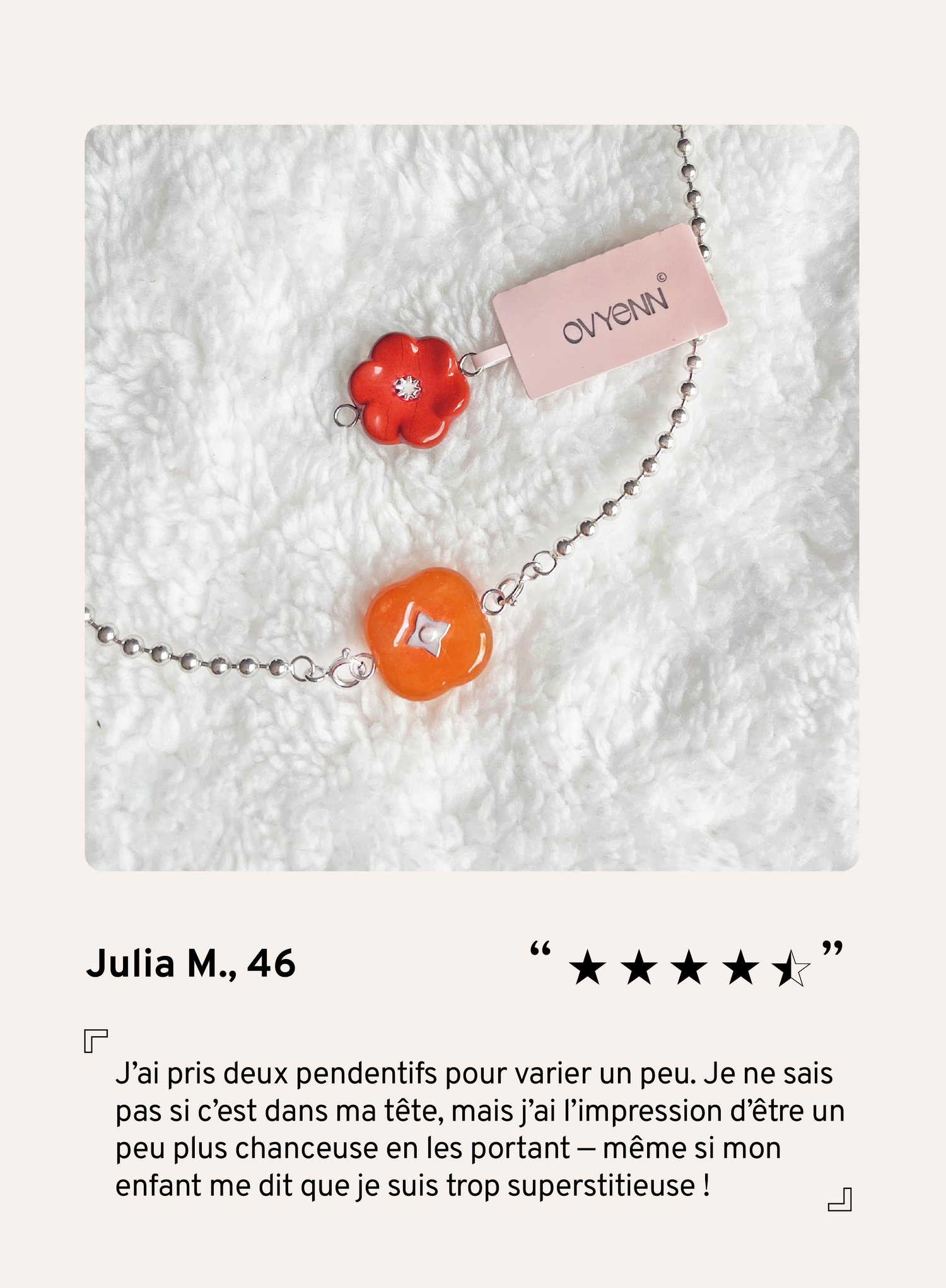 Sa passion l’a conduite à fonder OVYENN, une marque de bijoux utilisant uniquement des pierres naturelles non teintées. Chaque pièce est conçue avec intention pour clarifier l’esprit, stimuler la motivation et favoriser la clarté émotionnelle… lire la suite.