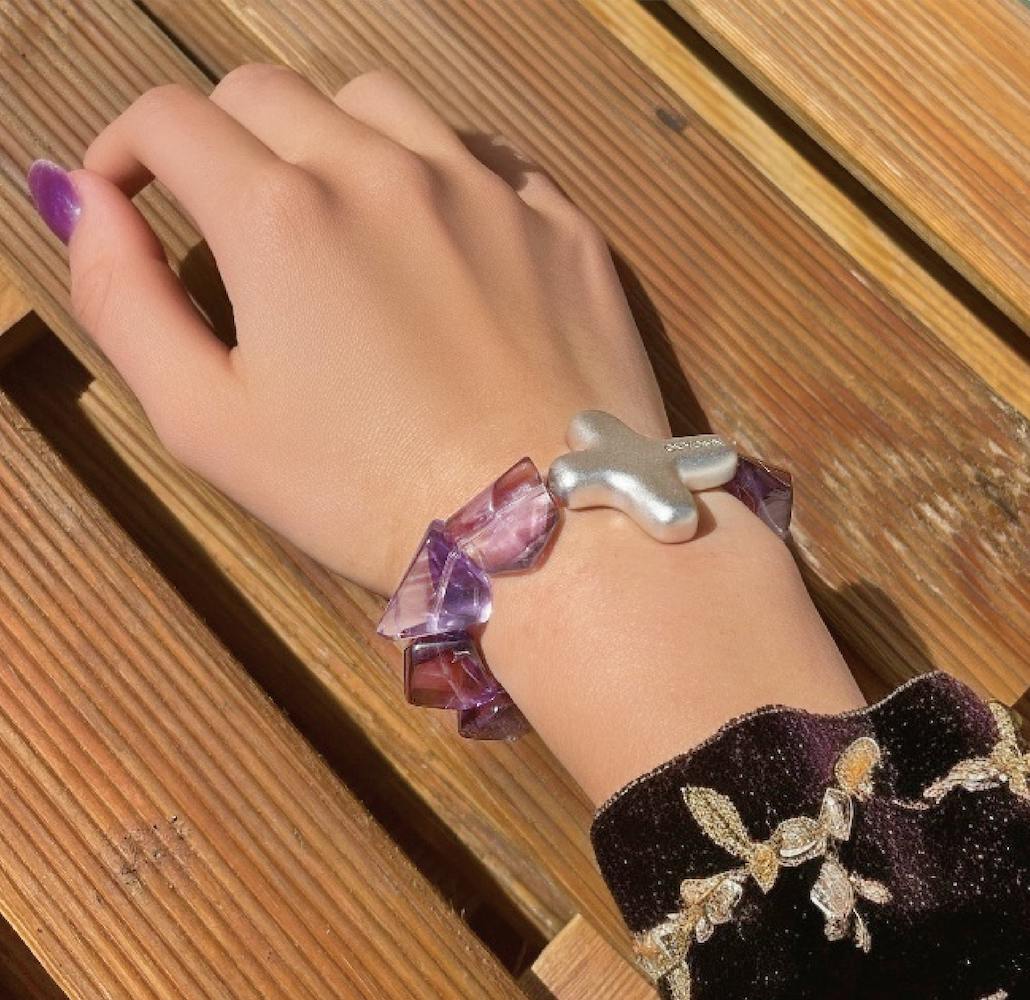 Each hand-selected amethyst is gently polished to reveal luminous clarity and organic shapes, making every piece unique—like miniature galaxies in motion adorning your wrist. The silver cross, carefully hand-molded, softly reflects the light like distant stars. Known for enhancing intuition, amethyst helps sharpen inner insight.